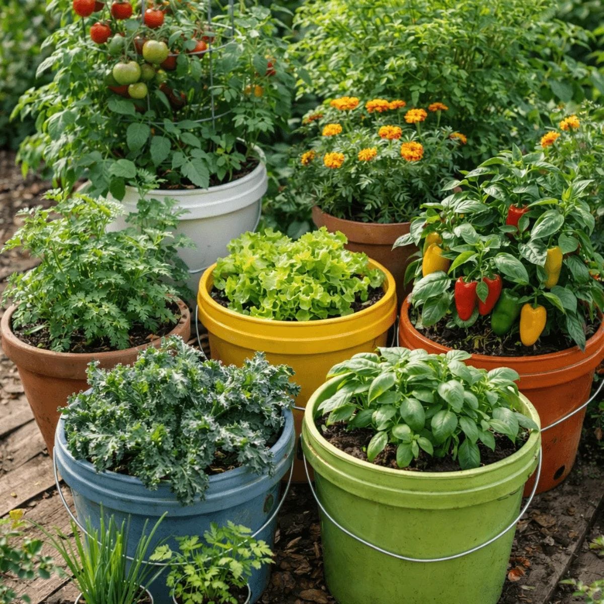 Using reused buckets and household items makes zero budget gardening easy even for beginners.